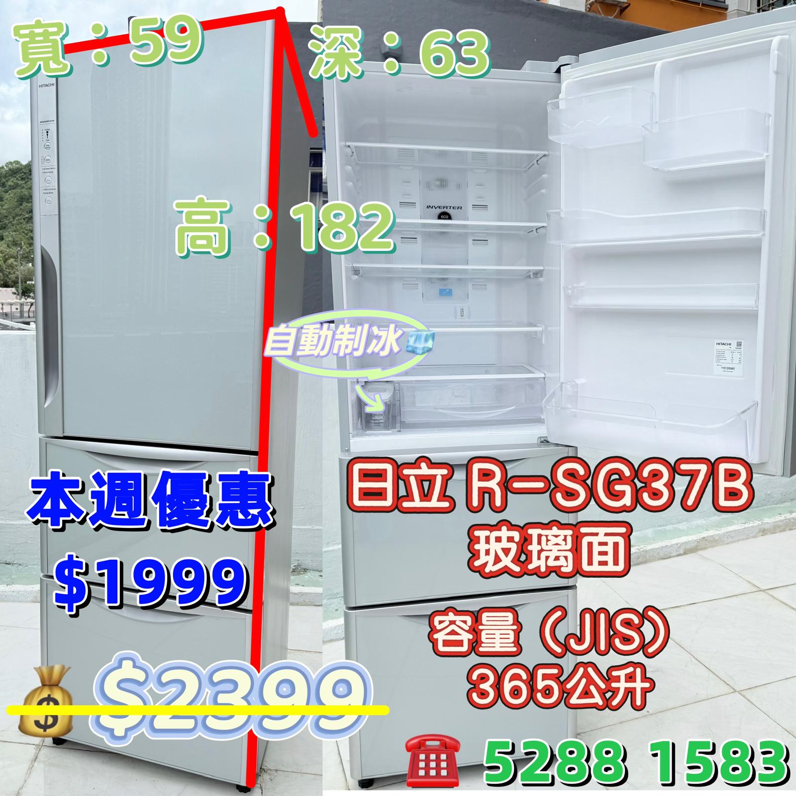 本週優惠 ❄️日立 Hitachi R-SG37B 玻璃面❄️ 三門雪櫃 可自動製冰 即買即用 365公升 182cm高 九成五新 包送貨安裝 有保用期 可貨到付款 信用卡付款 1,999.00 HKD 0.00 HKD