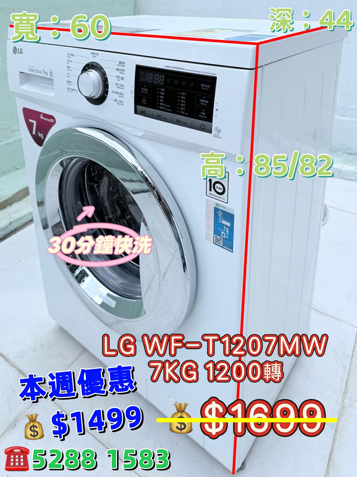 本週優惠 ♻️LG WF-T1207MW♻️ 7KG 1200 轉 前置式薄身型洗衣機 九成新 包送貨安裝 有保用期 可貨到付款 信用卡付款