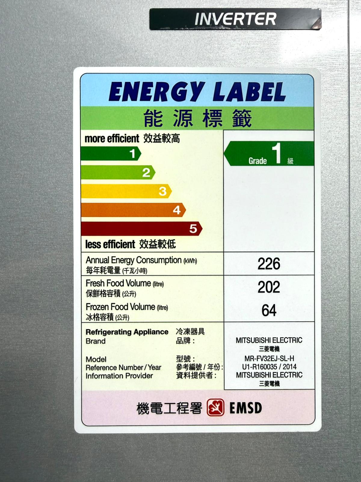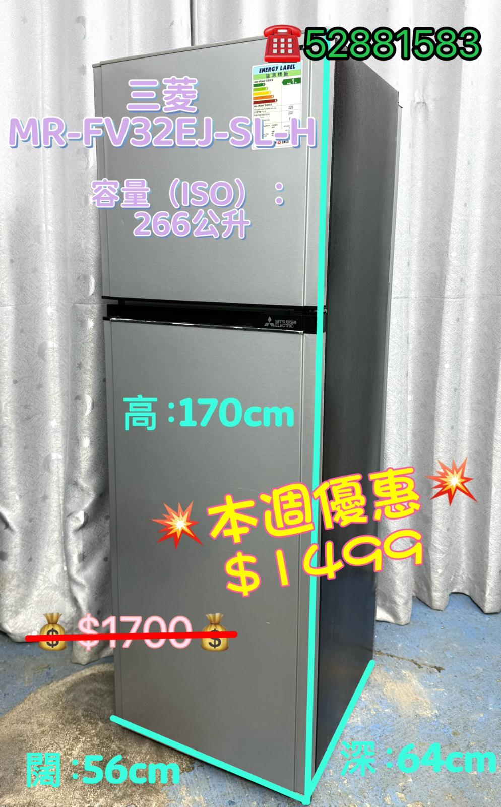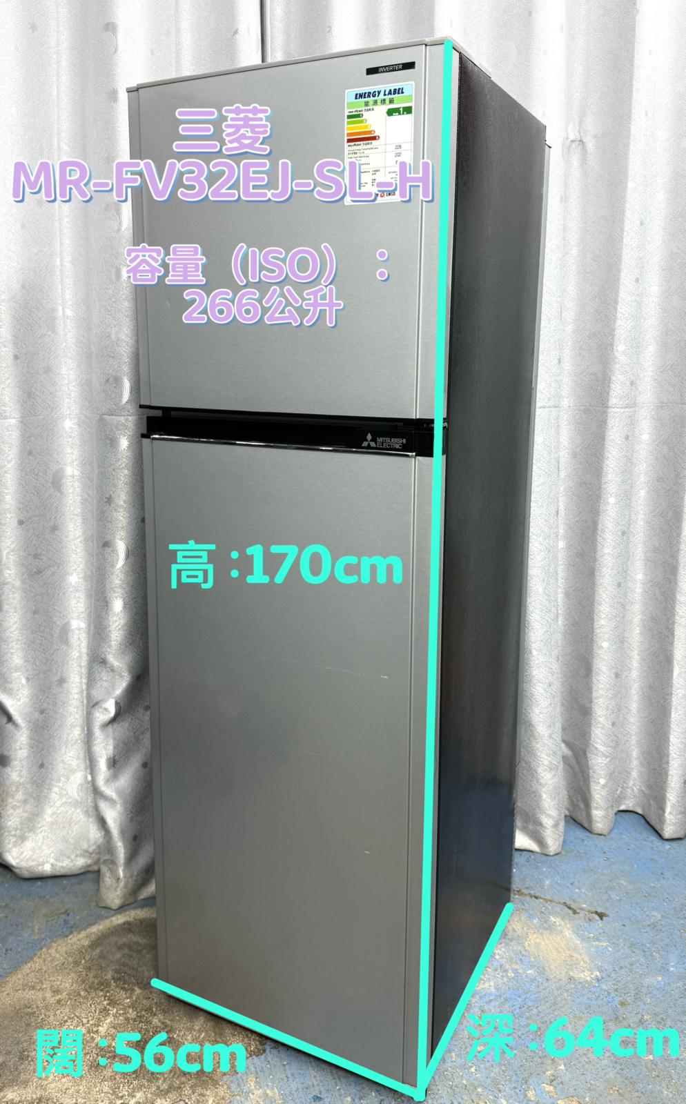 型號:MR-FV32EJ-SL-H牌子:三菱容量:266公升狀態:機件100%正常 95%新體積:170CM高X56CM寬 X 64CM深售價:$1499